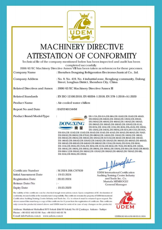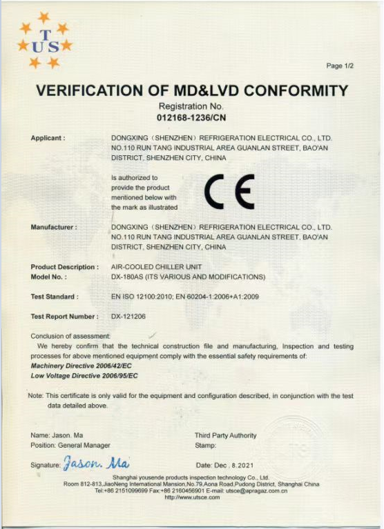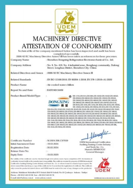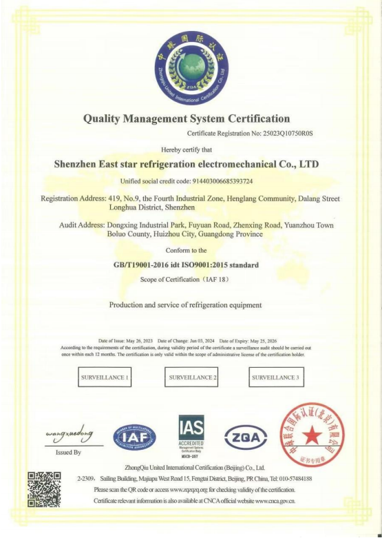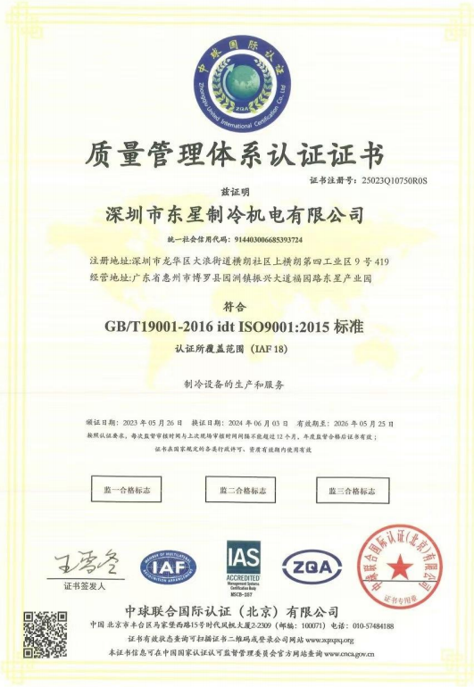 Shenzhen Dongxing Refrigeration Electromechanical Co., Ltd. has passed ISO9001 quality management system certification. Thanks to our strict quality control system that runs through every aspect of design, manufacturing, inspection, and packaging, all industrial refrigeration machines from Dongxing Refrigeration comply with CE certification standards.